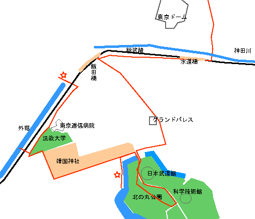 その後、靖国神社を迂回して(本当は中に入ってもよかったかも)外堀へ。法政大学の裏から東京逓信病院のある道では学生たちが花見をしていた。この道にはランプもあり、夕暮れ時にこの通りを歩くのも情緒があるだろう。本当はそのランプも撮影したかったのだが、人が映ってしまうため、あきらめた。